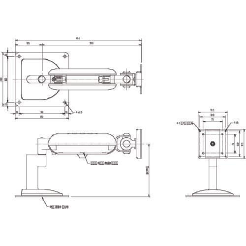 【特長】●アーム部は上下75°ずつ可動し、モニター取付部はチルト(30°ずつ)、スイベル(90°ずつ)、回転(360°)の機能が付いています。●水平面に対して直接ボルトなどにて固定するタイプです。●VESA75ミリ、100ミリどちらのモニターにも取り付け可能です。●21インチクラスまでのモニターに対応しています。