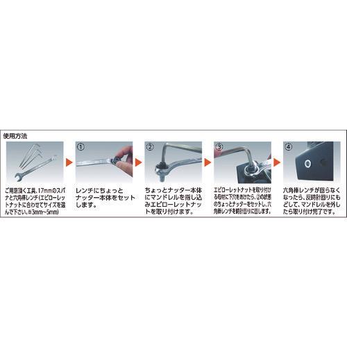 【仕様】●セット内容:M4用ナッター本体1個、六角穴付マンドレル(対辺3mm)1個、スチール製ナット(NSD4MR)10個