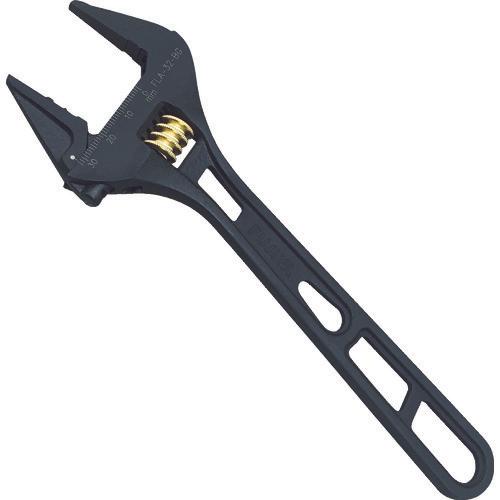 【特長】●軽量・薄型タイプかつワイドな開口により、狭い場所でさまざまなサイズのボルトを回すのに最適です。●0mmまで閉じるので、小さいものまでしっかりとつかめます。●目盛付です。●でっぱりが少なく狭い場所でも使いやすくなっています。●ボルトやナットの角を傷つけにくい独自形状です。