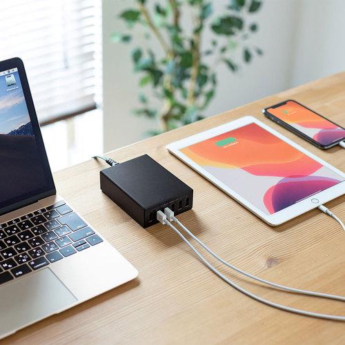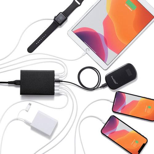 【特長】●最大6台のスマートフォンやタブレットなどをまとめて充電できる、合計最大出力12Aに対応した高出力タイプのUSB充電器です。●USB出力は1ポートあたり最大2Aまで対応しており、最大6台のUSB充電対応機器を同時に充電することができます。●横置き、縦置きどちらにも対応しています。●日本メーカー製コンデンサを採用した約30000時間の高耐久設計により長寿命化を実現しています。●トラッキング火災を予防する絶縁キャップ付きACプラグを採用しています。●ケースには難燃性樹脂(UL94規格V-0相当)を採用しています。●接続機器の負荷電流が本製品の最大出力を超えた場合、出力を停止します。