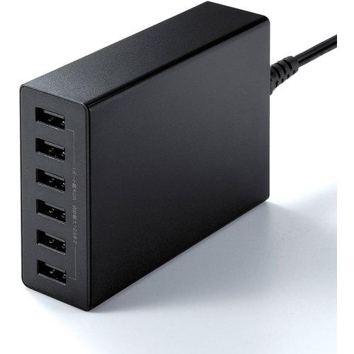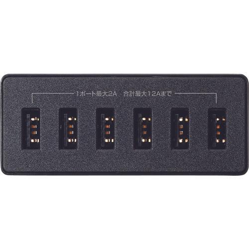 【仕様2】●プラグ形状:2P●ポート数:USB Aポート×6ポート●電源コード長:約1m●定格入力:AC100V50/60Hz●定格出力:DC5V/12A(6ポート合計最大)、DC5V/2A(1ポートあたり最大)