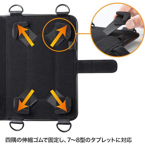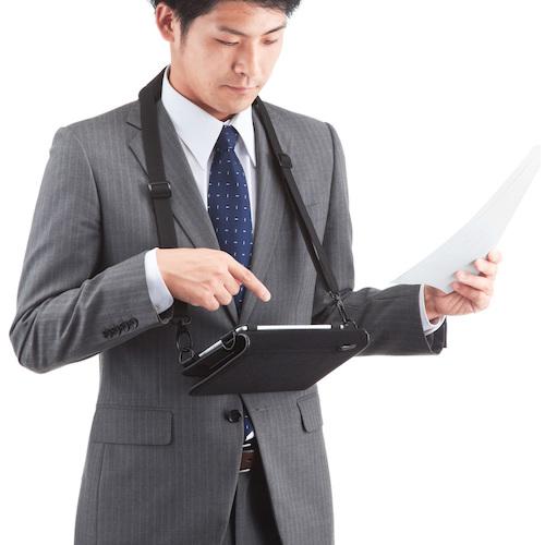 【特長】●四隅の伸縮ゴムで固定し、さまざまなタブレットPCに対応します。●ケース内面に低反発ウレタン素材を使用し、外部からの衝撃から機器を守ります。●ケースの縁の部分は丈夫なバンパーを装備しており、辺方向、角部分も衝撃から守ります。●ショルダーベルト付きで立ったままタブレットPCを操作できるケースです。●ベルトを付け替えることで、縦・横どちらでもタブレットを操作できます。●背面にはハンドベルト付きで片手で操作可能です。●機器の管理に便利な、名刺ポケット、ペンフォルダー付きです。