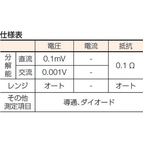 【特長】●本体を持ったまま測定できるテスト棒固定機能付です。●テストリードを本体に収納可能です。●CE規格品です。●安全規格IEC1010 CAT[[R3]]300V、CAT[[R2]]DC/AC500V適合品です。●最大表示:4000カウント