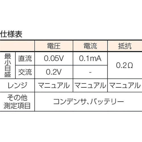 【仕様】●奥行(mm):41.5●交流電圧(V):600●交流電流(A):-●高さ(mm):159.5●直流電圧(V):600●直流電流(A):0.3●抵抗(Ω):200M●電源:単3乾電池(R6P)×2本(付属)●幅(mm):129●幅×奥行×高さ:129×41.5×159.5mm