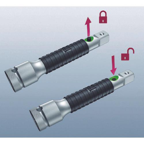 【特長】●ソケットロック機能付です。(赤いボタンを押すとロックがかかり、緑のボタンを押すとロックが解除されます)●軸部の空回り機能により、工具の早回しが可能です。