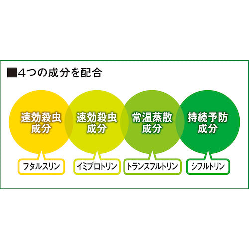The persistent ingredient cyfluthrin remains, providing insect repellent effects that last for up to one month (ambush killing effect against centipedes, spiders and ants in conditions that are not exposed to rain).