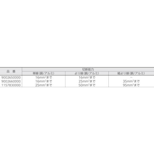 [Specifications] ● Cutting capacity: Single wire (copper/aluminum): Up to 16 mm [[square of]] ● Total length (mm): 185 ● Cutting capacity Single wire (copper/aluminum): Up to 16 [[MM2]] ● Cutting capacity Stranded wire (copper/aluminum): Up to 16 ([[MM2]]) Cutting capacity Fine stranded wire (copper/aluminum): -