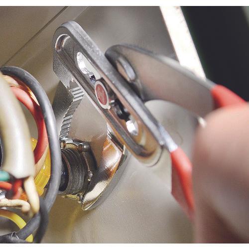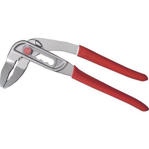 [Features] ● Extremely thin water pump pliers with tip thickness of 4 mm. ●The jaw teeth move in parallel, and the target can be securely caught at the same angle regardless of the mouth opening width. Equipped with a wire cutter for cutting wires and nails. ●With a safety stopper that prevents hands from getting caught. ●This is the first bent type water pump pliers.