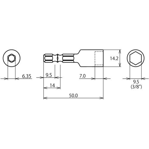[Specifications] ● Shaft dimensions (mm): 6.35 ● Overall length (mm): 50 ● Width across flats (mm): 9.5 ● Outer diameter (mm): 14.2 ● Nut receiving depth (mm): 7.0 ● Shaft diameter (mm) ): 6.35 ● Color: Silver ● Opposite side dimension (inch): 3/8 ● Shaft length (mm): 25 ● Model: Strok series ● Opposite side shape: hexagonal