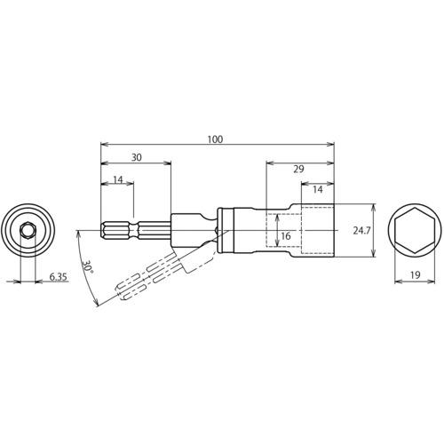 [Specifications] ● Shaft dimensions (mm): 6.35 ● Overall length (mm): 100 ● Width across flats (mm): 19 ● Outer diameter (mm): 24.7 ● Nut receiving depth (mm): 14.0 ● Shaft diameter (mm) ): 6.35 ●Color: Silver ●Shaft length (mm): 30 ●Model: Strok series ●Shape across flats: hexagonal