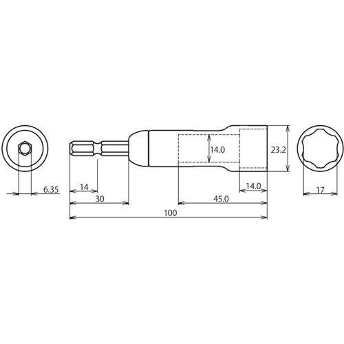 [Specifications] ● Shaft dimensions (mm): 6.35 ● Overall length (mm): 100 ● Width across flats (mm): 17 ● Outer diameter (mm): 23.2 ● Nut receiving depth (mm): 14.0 ● Shaft diameter (mm) ): 6.35 ●Color: Silver ●Shaft length (mm): 30 ●Model: Strok series ●Shape across flats: Surface