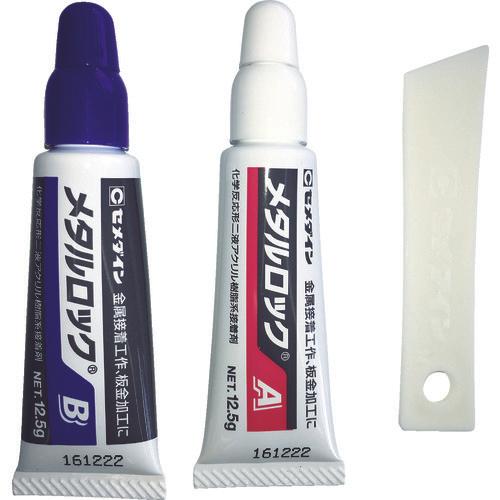 [Features] ●High viscosity type. ●It is a 2-liquid, room-temperature curing type. ●Solvent-free type. ●There is no strong odor like conventional acrylic adhesives. ●Can be stored for a long time at room temperature (5-35℃). ●Good adhesion to oily surfaces. ● CEMEDINE Metal Lock is a two-liquid acrylic adhesive. ●It adheres very well to metals. ●For 2-part epoxy adhesive, it is necessary to mix thoroughly at the correct mixing ratio. ●A little oily surface is fine.