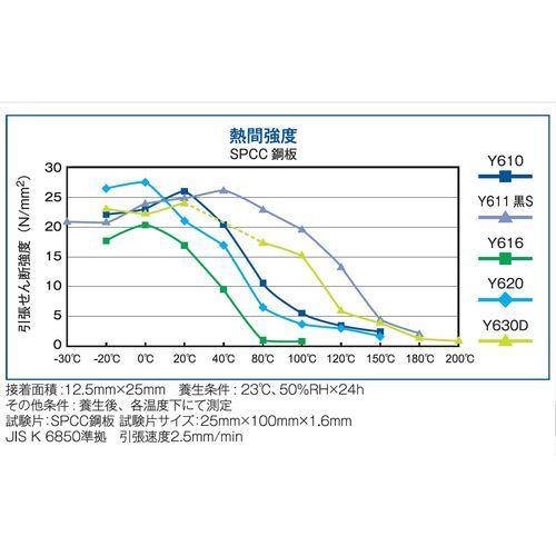 [Features] ●Heat-resistant type. ●It is a 2-liquid, room-temperature curing type. ●Solvent-free type. ●There is no strong odor like conventional acrylic adhesives. ●Good adhesion to oily surfaces. ●Short-time adhesion. ●Long-term storage at room temperature (5 to 35°C) is possible. ●For details, refer to the test data in the "Metal Lock Y600 Series Technical Sheet".