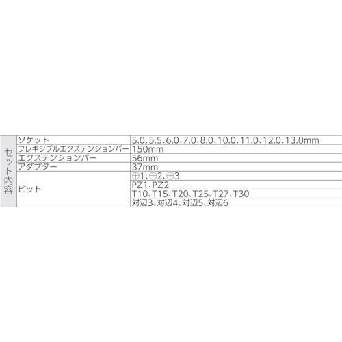 [Specifications] ● มุมแทรก (มม.): 6.35 ● เนื้อหาที่จับ: วงล้อ Cyclops (003500) ● เนื้อหาในเซ็ต (จุด): 28 ● ขนาดตัวเรือน (มม.) ส่วนหน้า: 185 ● ขนาดตัวเรือน (มม.) ความลึก: 88 ● ขนาดตัวเรือน ( มม.) ความสูง: 46 ● อะแดปเตอร์ (37 มม.) ● แถบขยาย (56 มม.) ● ซ็อกเก็ต (5.0, 5.5, 6.0, 7.0, 8.0, 10.0, 11.0, 12.0, 13.0) ● บิต +1, +2, +3 , PZ1, PZ2, T10, T15, T20, T25, T27, T30, ความกว้างของแฟลต 3, ความกว้างของแฟลตทั้งหมด (150 มม.)