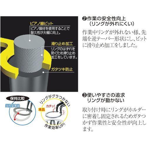 [Tính năng] ● Một dây đàn piano cứng được sử dụng ở đầu để đạt được độ bền và khả năng chống mài mòn cao. ●Để ngăn vòng đệm rơi ra trong quá trình vận hành, đầu có hình dạng thuôn nhọn ngược và đầu mũi khoan có lớp hoàn thiện chống trượt. ●Do vòng được gắn chặt vào giá đỡ trong quá trình lắp đặt nên khả năng làm việc và độ an toàn được cải thiện mà không phát ra tiếng lạch cạch.