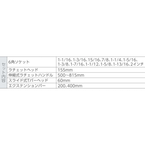 [Đặt nội dung/Phụ kiện] Ổ cắm lục giác: 16/11, 16/13, 15/16, 7/8, 1-1/4, 1-5/16, 1-3/8, 1-7/16, 1 -1/12, 1-5/8, 1-13/16, 2 cái - Đầu bánh cóc 155 mm - 1 tay cầm bánh cóc dạng ống lồng 500 ~ 815 mm - 1 đầu thanh chữ T trượt 60 mm - Thanh mở rộng 200 mm, 1 cái cho mỗi cái 400mm