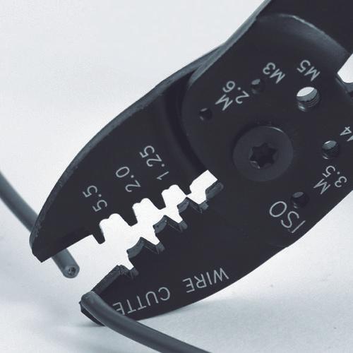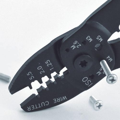 [Tính năng]● Uốn các đầu cốt dạng thùng hở và các đầu cốt để uốn trần, cắt bu lông và dây, đồng thời tuốt dây bằng dụng cụ này.