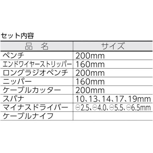[套装内容/附件] - 钳子 (0307200):200mm - 末端剥线钳 (1107160):160mm - 长无线电钳 (2617200):200mm - 钳子 (7007160):160mm - 电缆剪 (9517200):200mm - 扳手 (980010) , 980013, 980014, 980017, 980019): 10, 13, 14, 17, 19 mm INA螺丝刀 (982025, 982040, 982055, 982065): [[-]]2.5, [[-]]4.0, [ [-] ]5.5, [[-]]6.5mm 电缆刀 (9852): 190mm