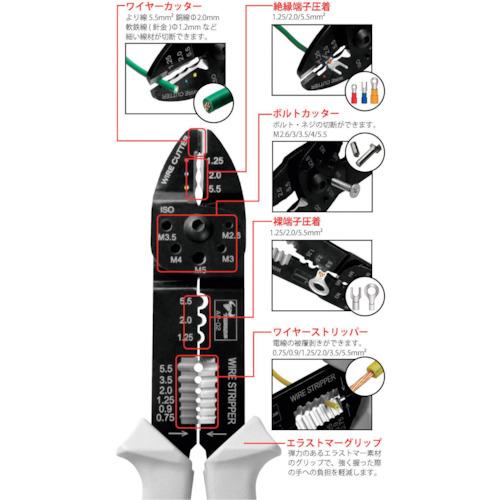 [特点] ● 配备电气配线所需的5种功能(剪线钳、绝缘端子压接、螺栓/螺丝切割、裸压接端子压接、剥线钳)。 ● 弹性把手,手感舒适。