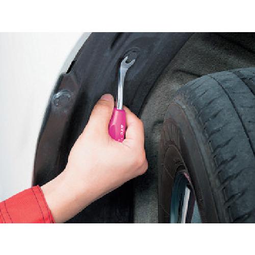 [特点] ● 采用长枪形尖端,支持3槽和4槽锁销拉出型。 ●插入尖端使其滑入锁销时,KTC独特的矛形尖端形状和中间轴的倾斜角度将锁销向上推,使销自然脱落。 ●插入后无需抬起把手,轻轻一按即可拔出锁销。 ●通过修改尖端尺寸,可以牢牢抓住锁销,减少破损的风险。 ●由于是粗短型,可以在狭窄的空间内作业。 ●车门饰板、车顶、地板等内部使用的装饰夹、毛刷夹也可拆卸。